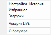 Меню открывает доступ к настройкам, закладкам, истории, загрузкам, аккаунтам LIVE и информации.