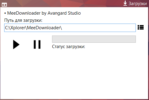 Загрузчик для браузера разработан Avangard Studio. Это Beta-версия программы. Он имеет небольшой функционал. Файлы скачиваются в C:\Xplorer\MeeDownloader\.